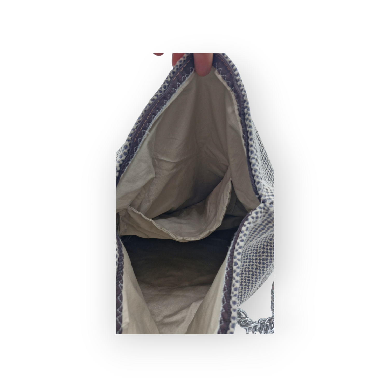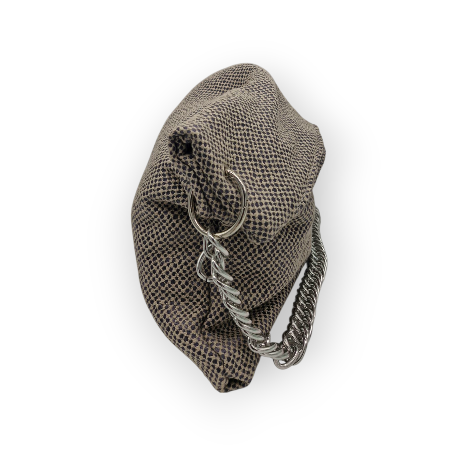 Derivata dal riuso di fodere da cuscini, questa borsa può essere utilizzata come maxi-clutch staccando la catena, come shopper o borsetta a spalla (nel caso di catena lunga, basta far passare la catena all'interno del moschettone e doppiarla) solo decidendo a che altezza attaccare i moschettoni.