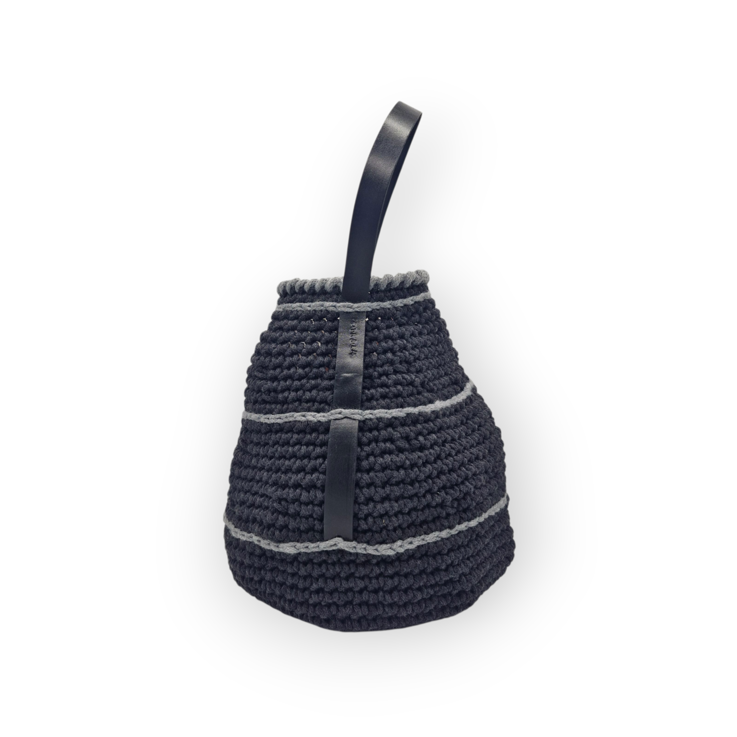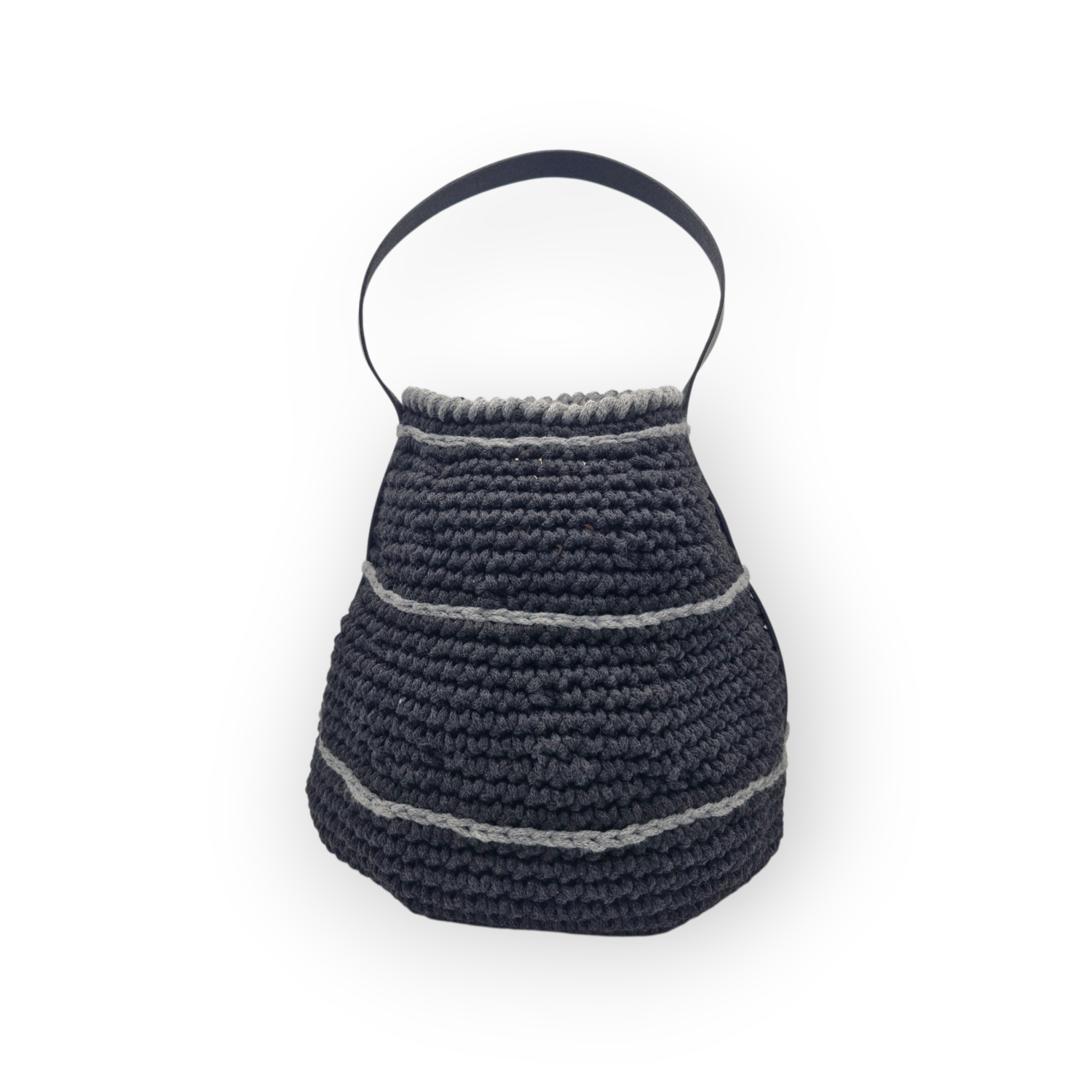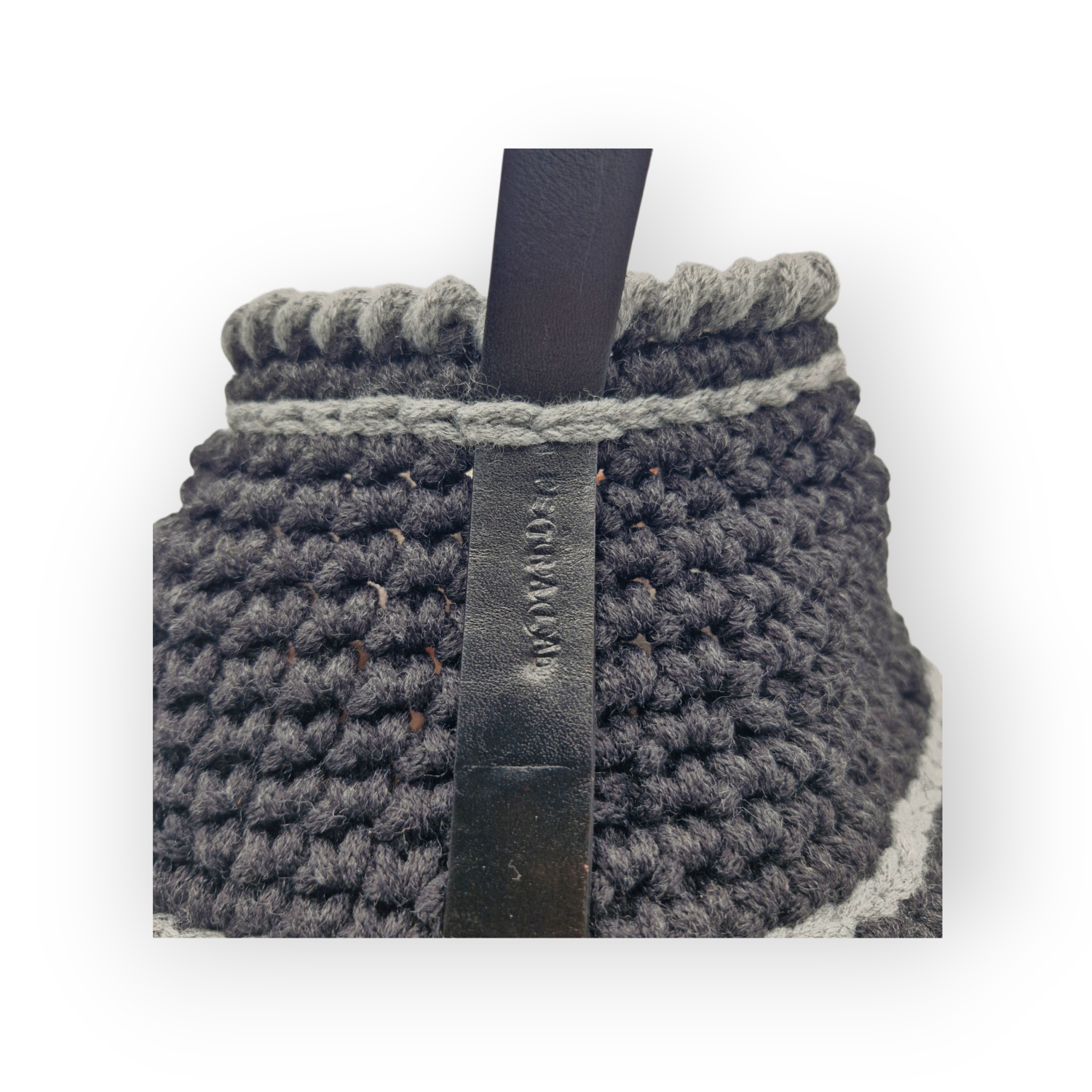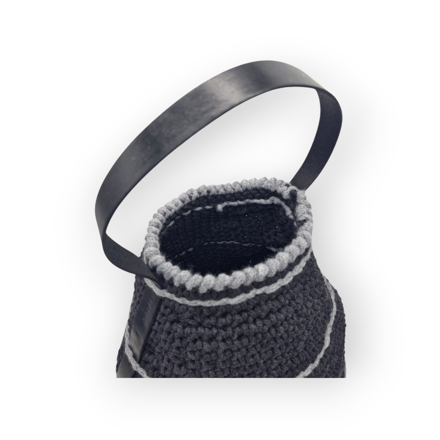Eseguita ad uncinetto in cordino lanato color antracite, con ricamo trasversale in grigio chiaro che ingloba e rafforza la cinghia in vera pelle, punzonata con il marchio impresso, facendola diventare anche elemento decorativo e non solo strutturale.