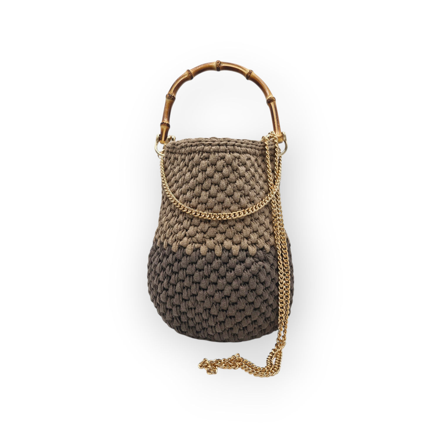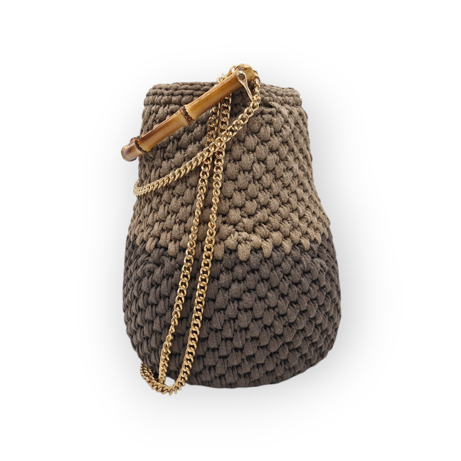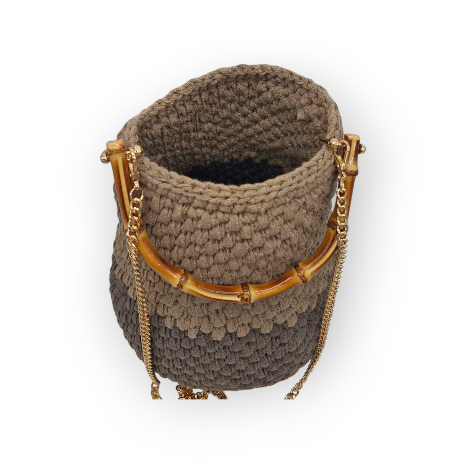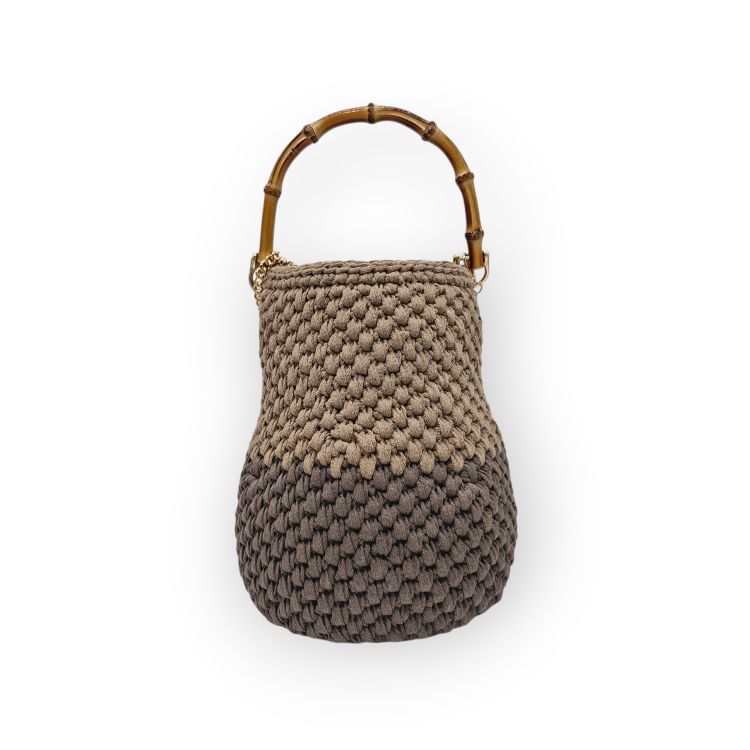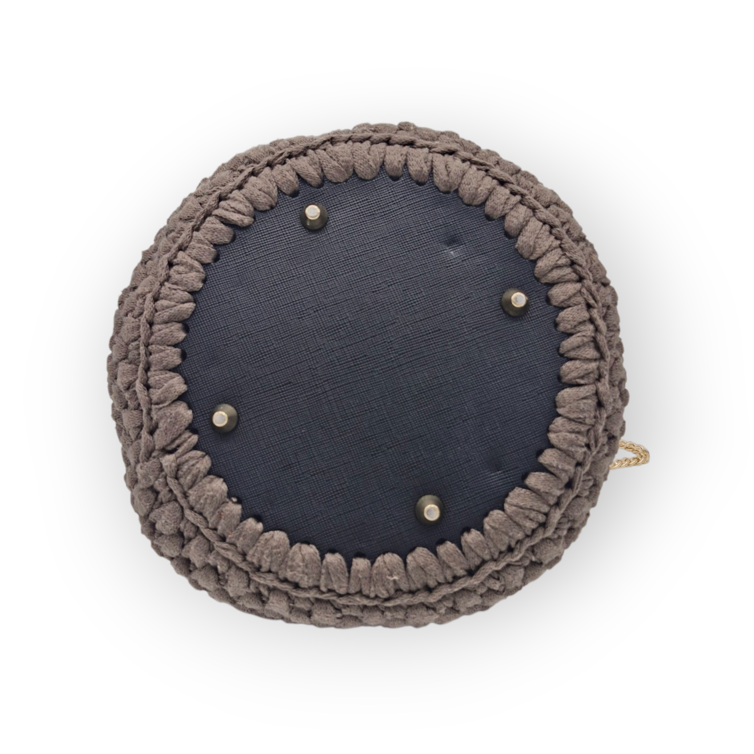 Eseguita ad uncinetto in fettuccia tagliatelle di cotone, nei toni caldi del tortora abbinato al beige. Fondo tondo in ecopelle.