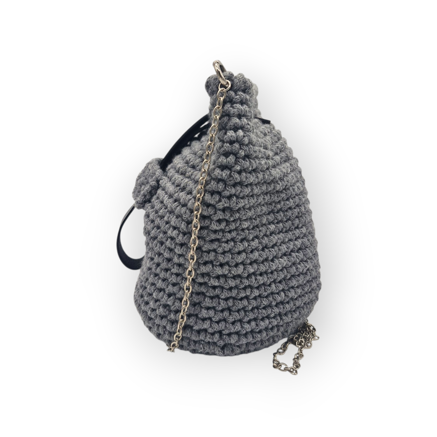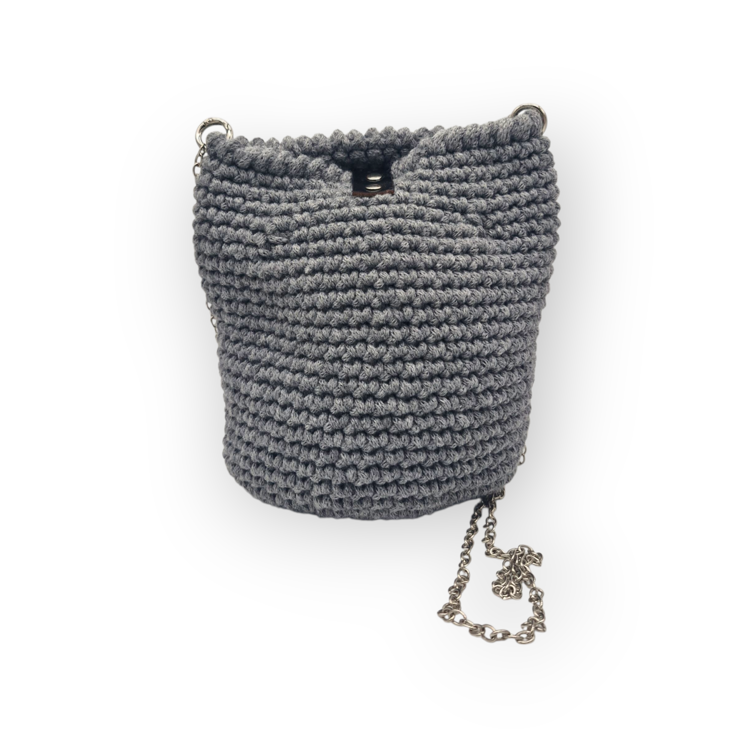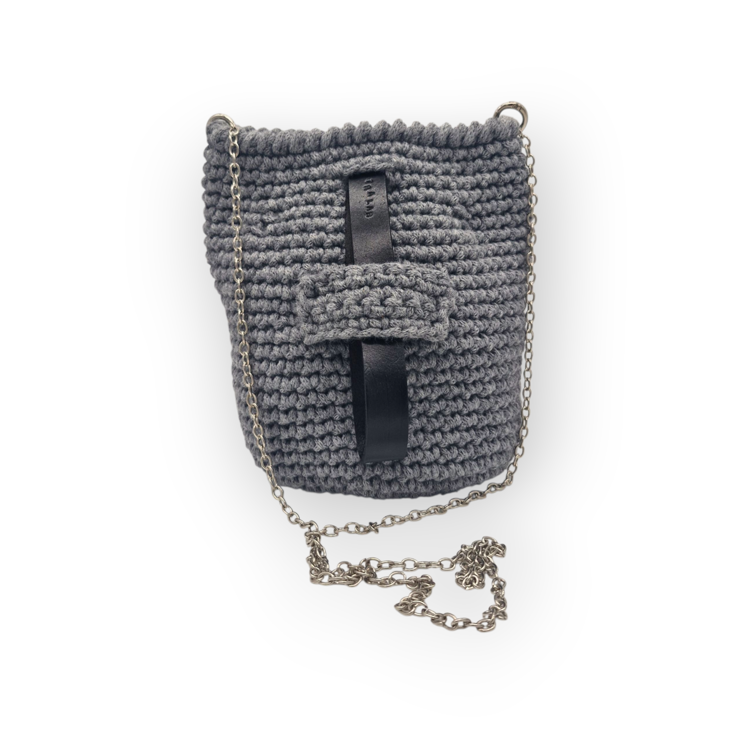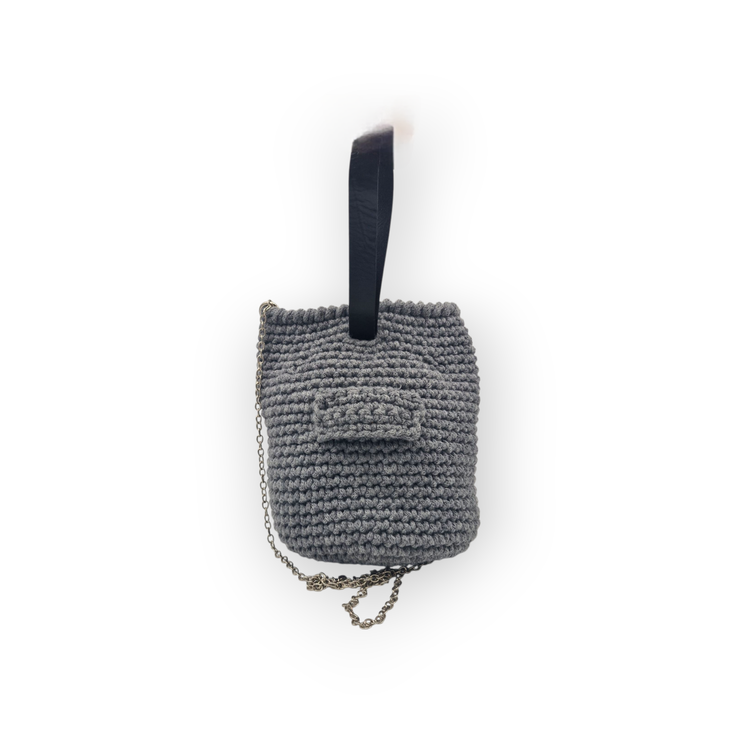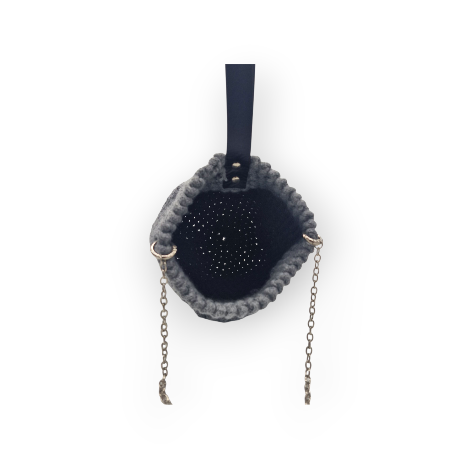 In cordino lanato grigio, ha una cinghia in pelle nera che passa all'interno di un asola frontale chiudendo la borsa e creando così il manico che, a sua volta, infilato nel passante frontale crea una sicurezza ulteriore.