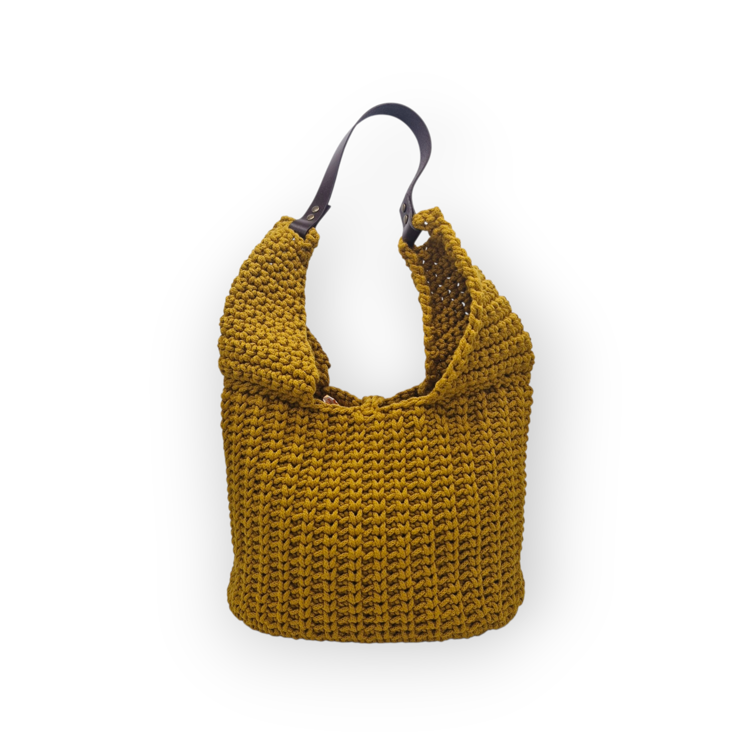 Tote Bag in cordino lanato lavorato ad uncinetto, con cinghia in vera pelle