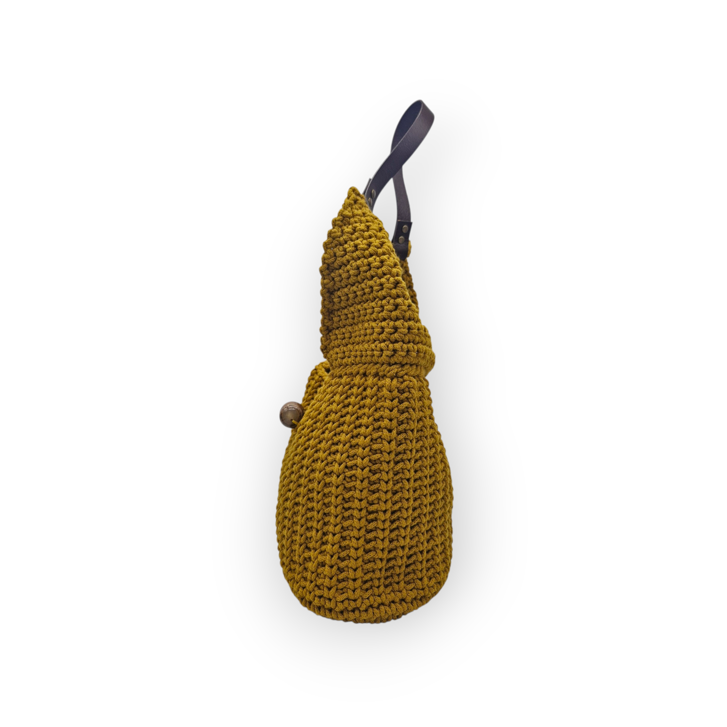 Lavorazione che ricorda la maglia inglese, dona a questa borsa un calore adatto alla stagione invernale, in uno splendido color zafferano abbinato alla pelle, per la cinghia a spalla, in testa di moro, chiusura con un bottone vintage.