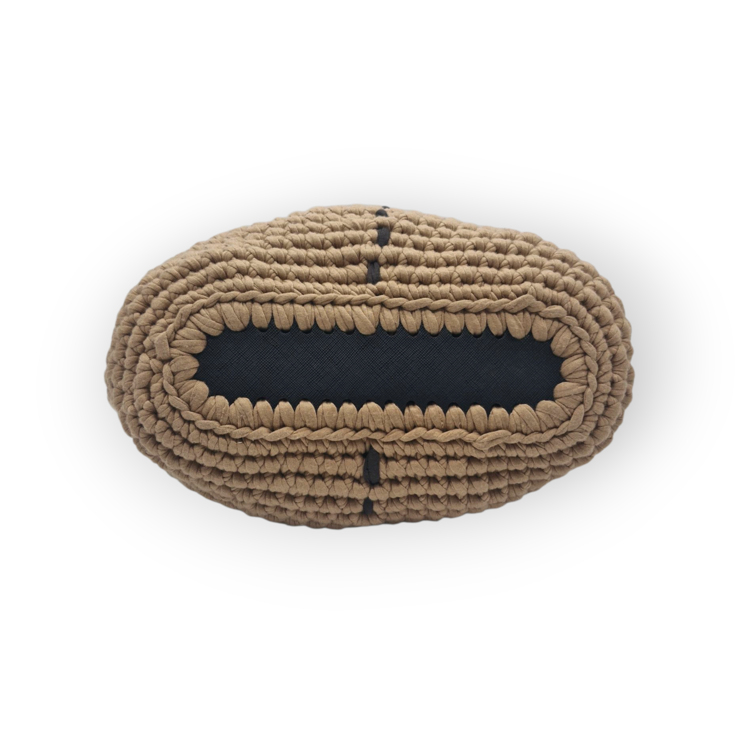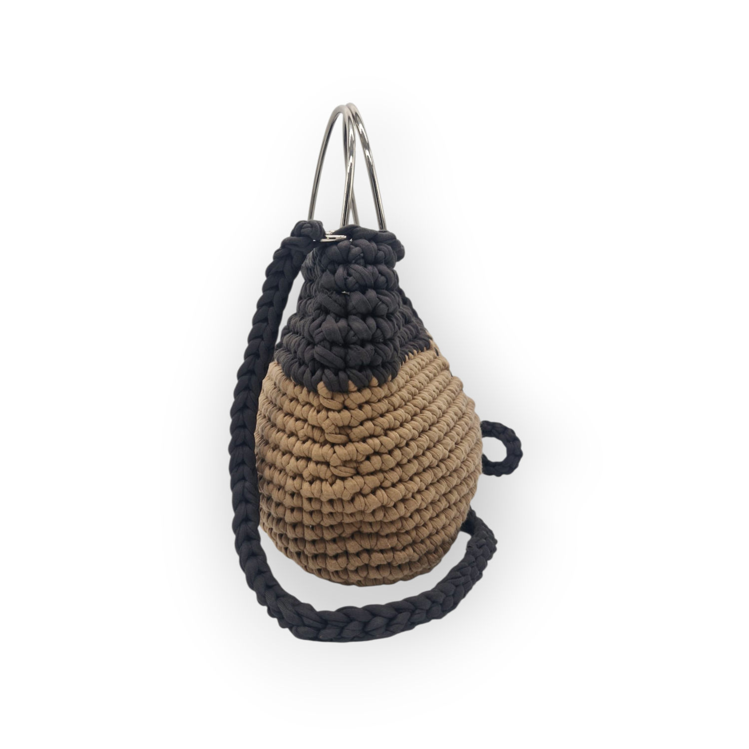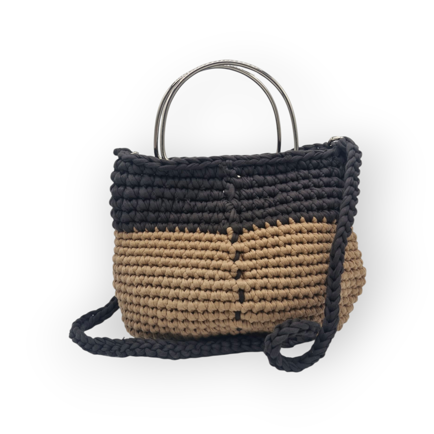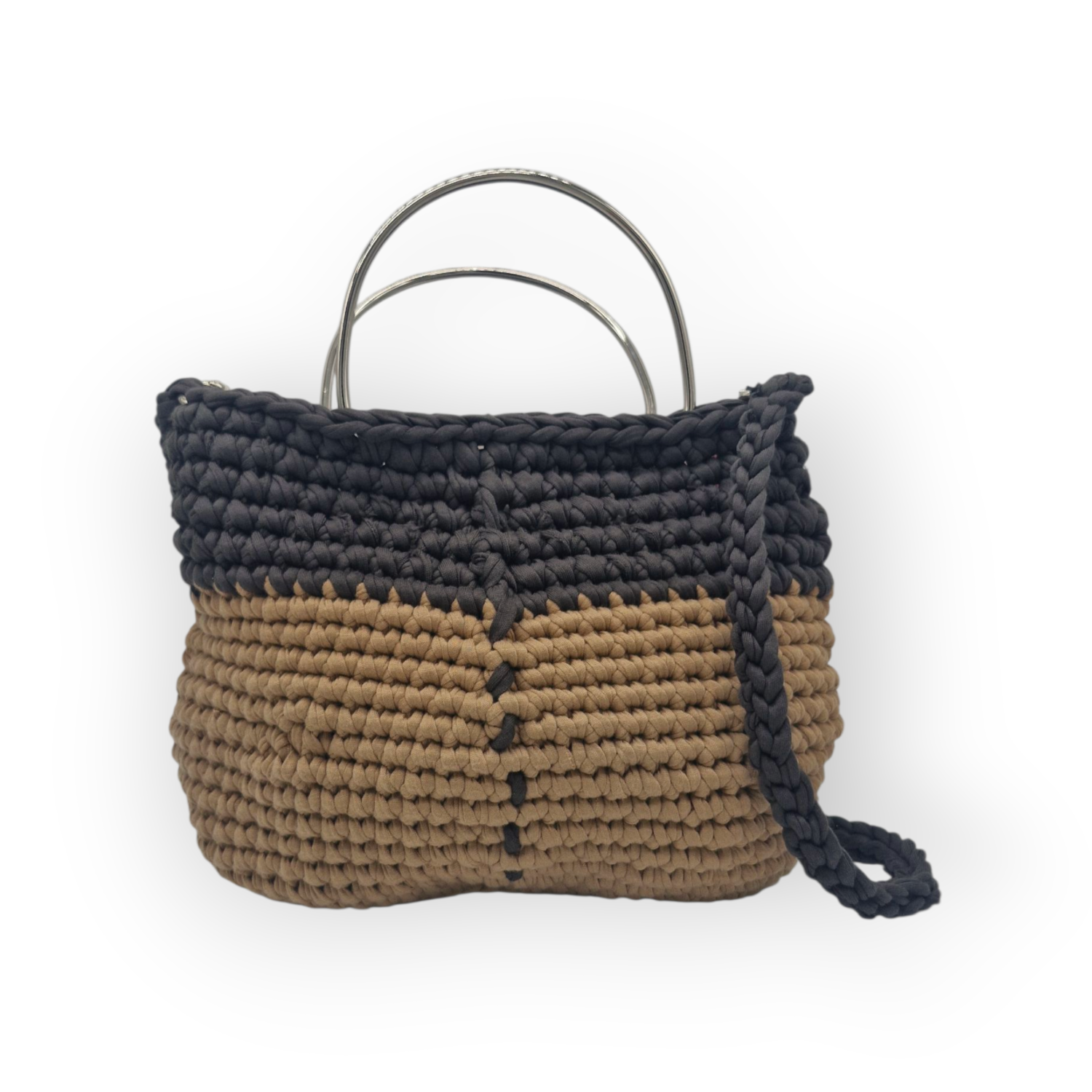 Borsa artigianale lavorata ad uncinetto in fettuccia color Cammello ed Antracite; manico a semicerchio in acciaio