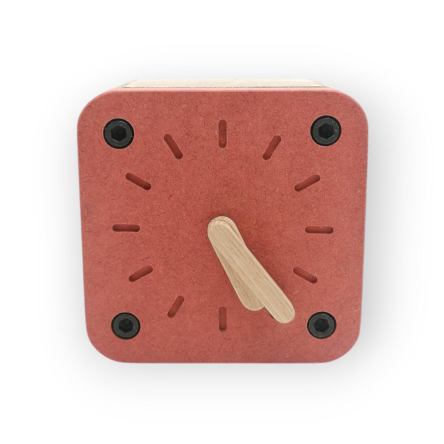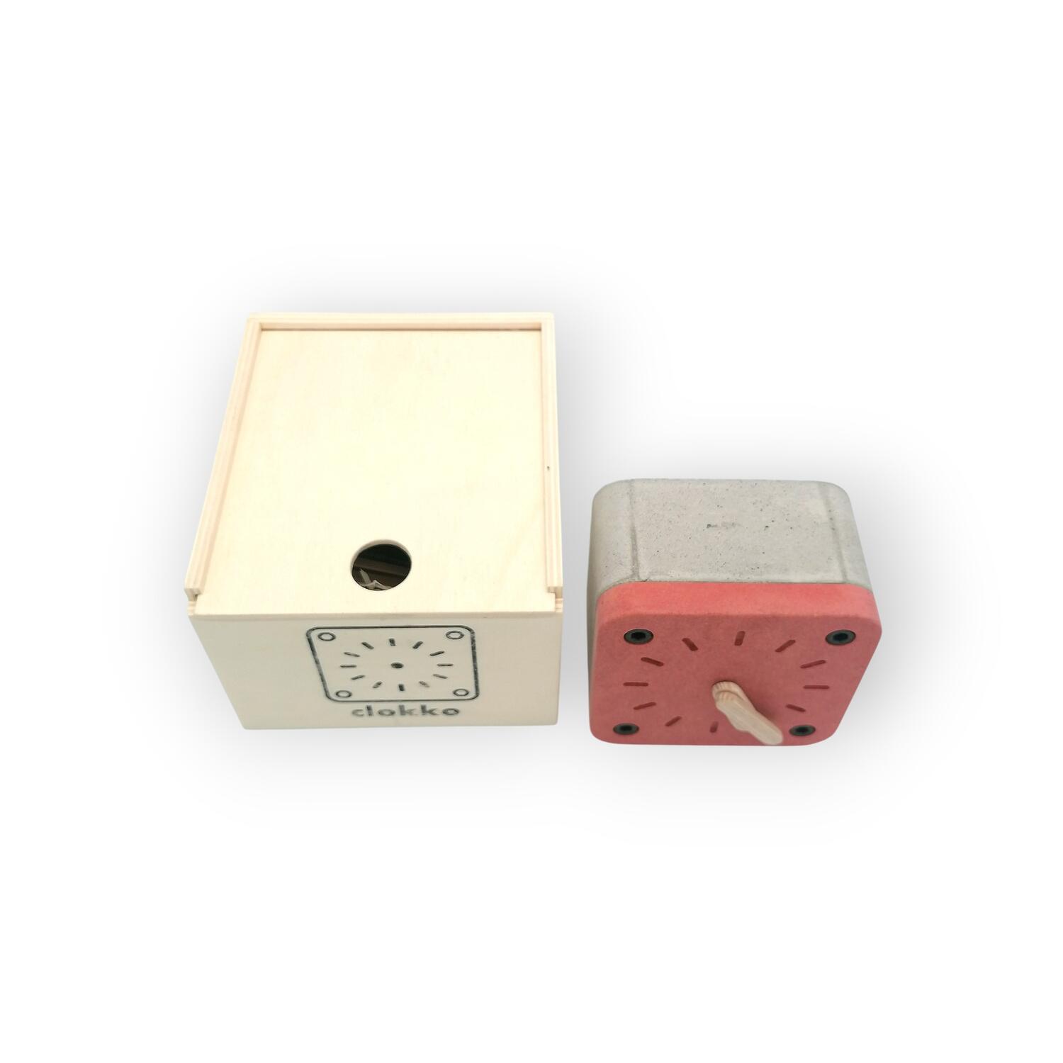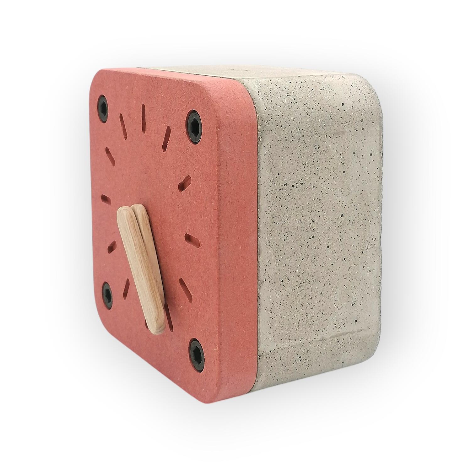 La cassa è relaizzata in cemento tramite stampo, il quadrante in Valchromat, un materiale innovativo disponibile in varie colorazioni, le lancette in legno massello.