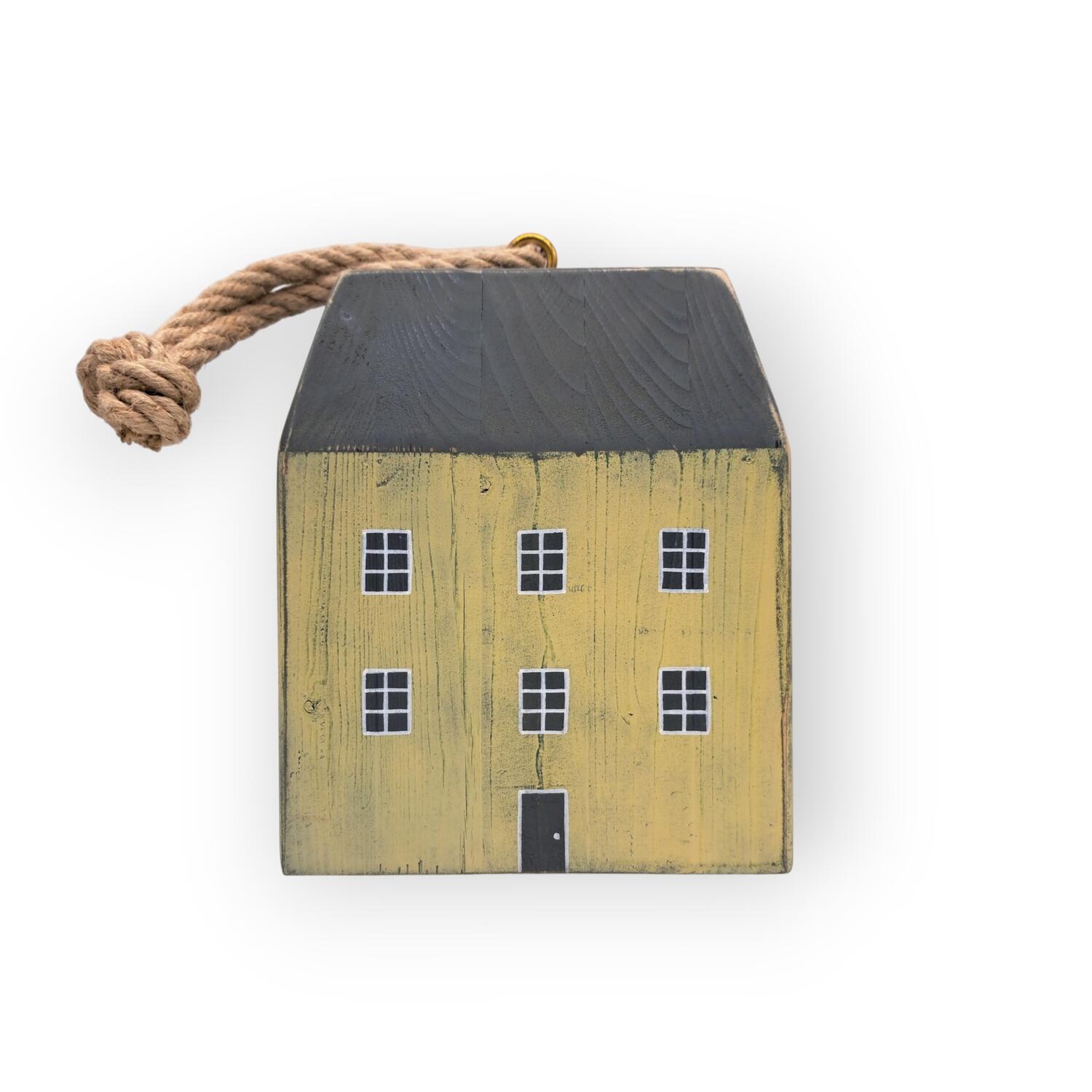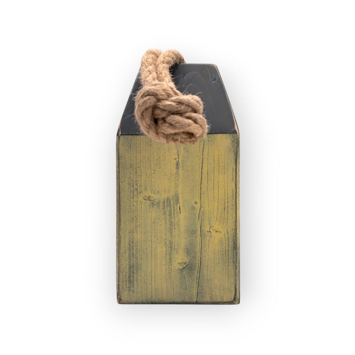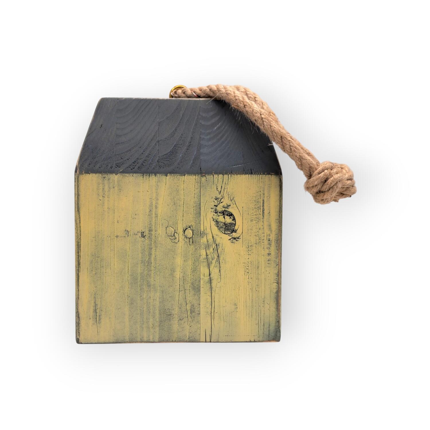 Casa fermaporta in legno massello di abete, realizzata e pitturata a mano. Dotata di corda ancorata al tetto per agevolare la movimentazione