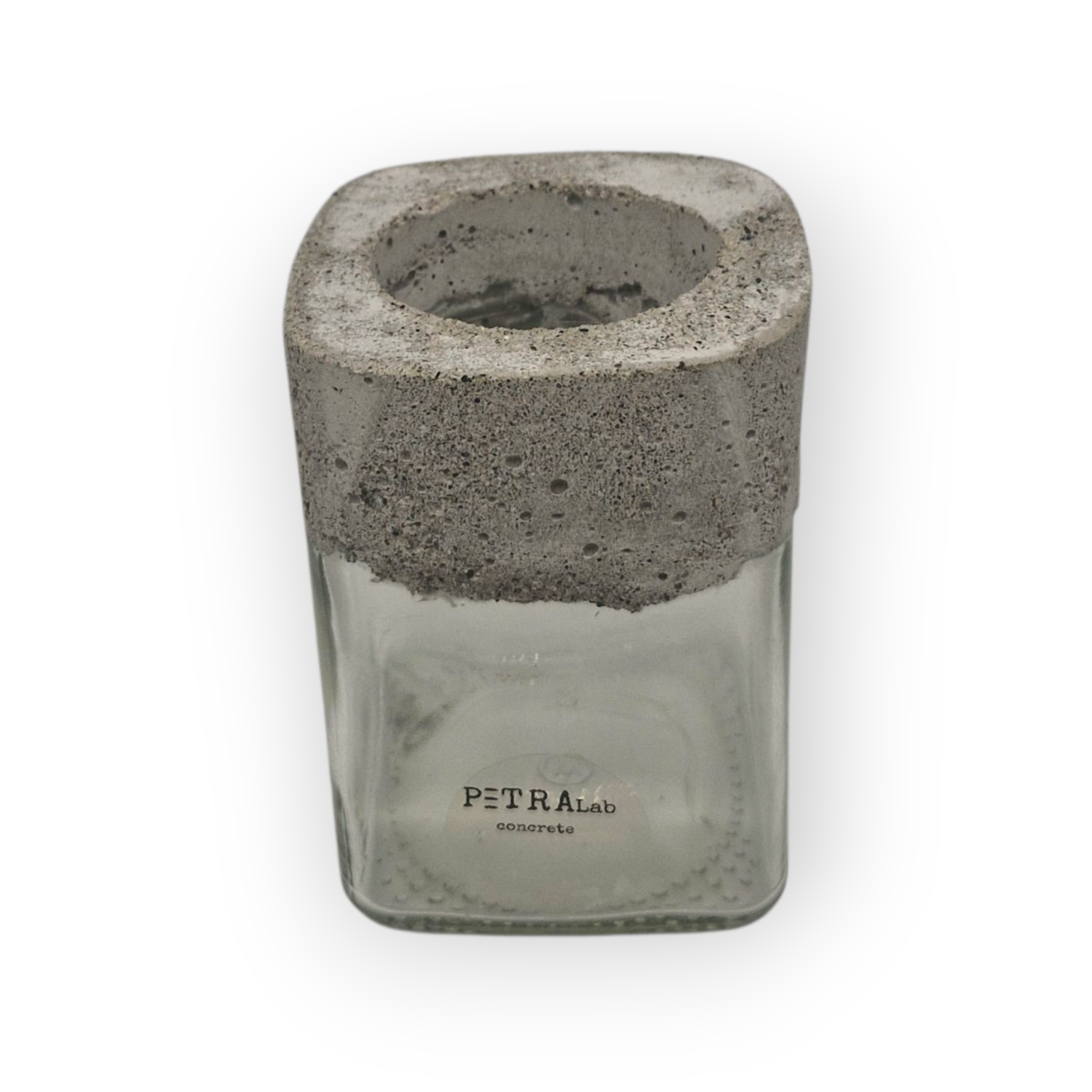 Barattolo da sott'oli ri-utilizzato a vasetto grazie al collare in cemento.